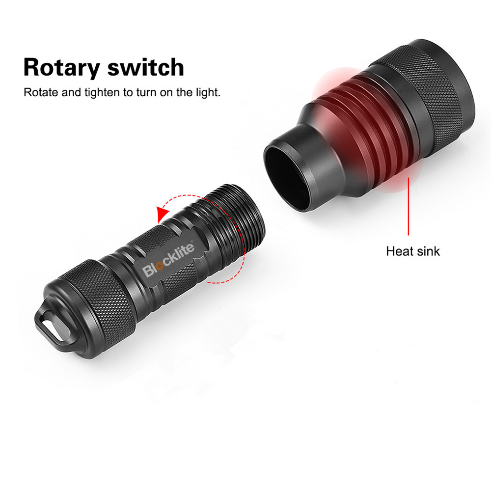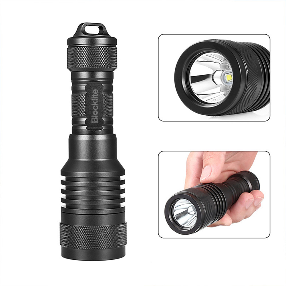 Blocklite SW-D02 is a palm-sized dive light with a mechanically rotary switch. The rotary switch offers high reliability underwater. Using the USA CREE XM-L2(U4) LED, its max output can reach 1100 lumens. Powered by one 1865000 battery, its max runtime can reach 4 hours.