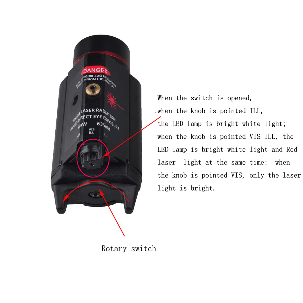 | when the knob is pointed VIS ILL, the LED lamp is bright white light and red laser light; |