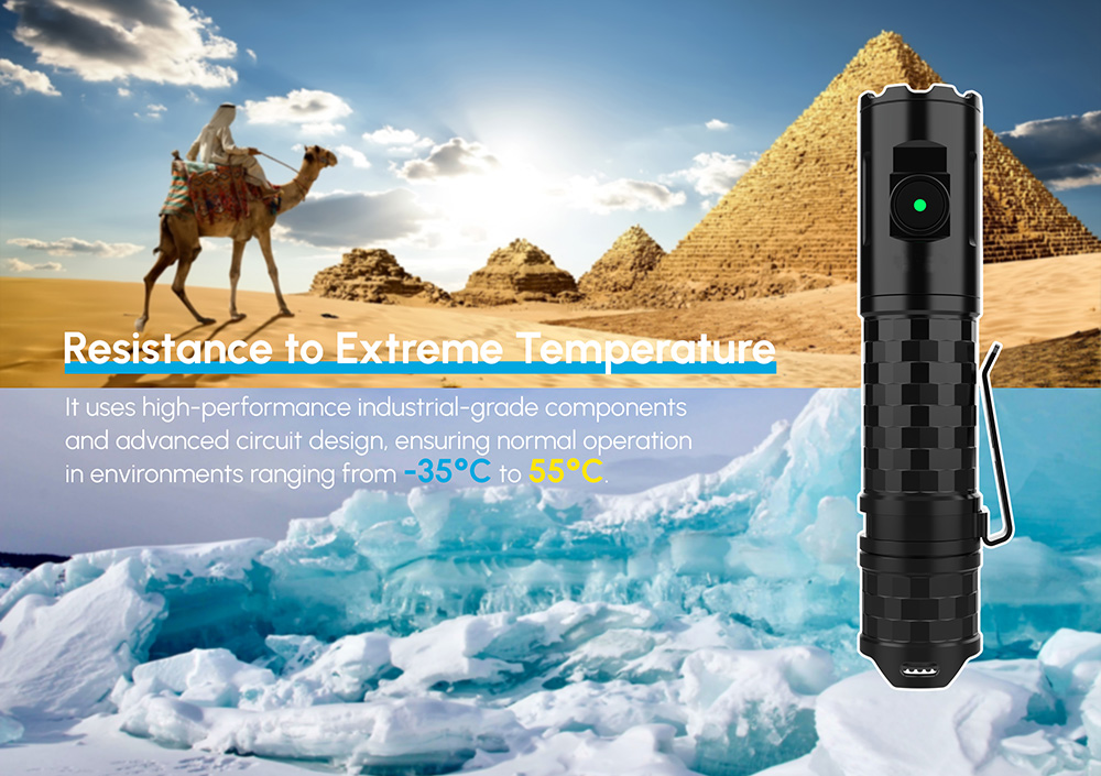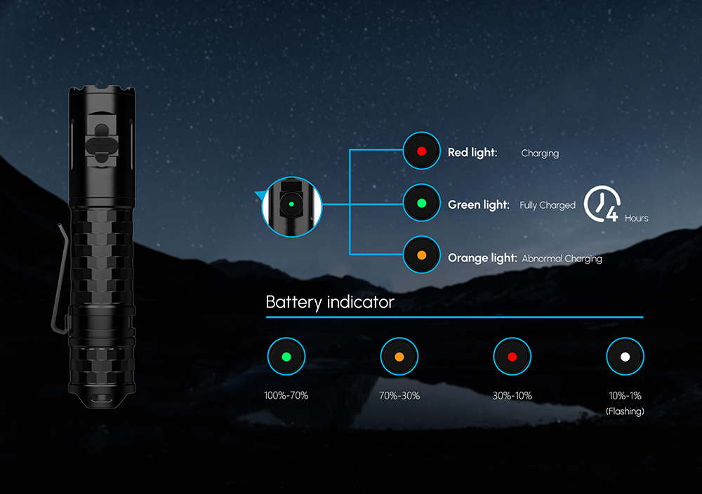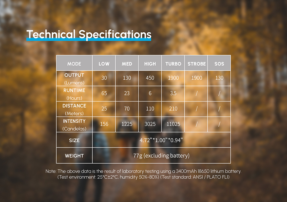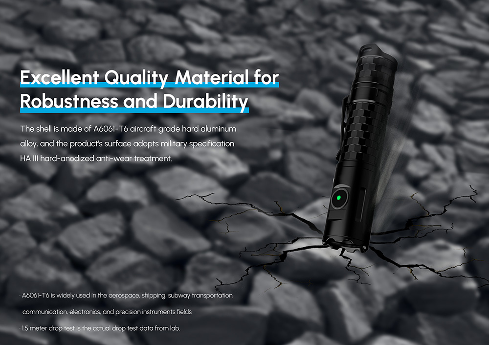 The Blocklite T20E is a portable outdoor flashlight with a maximum brightness of up to 1900 lumens and a remarkable runtime of up to 65 hours. It features four different brightness levels, as well as strobe and SOS modes, catering to various lighting scenarios. The T20E boasts an IP68 protection rating and can withstand drops from a height of 1.5 meters, offering robust durability. Equipped with a standard 3400mAh 18650 battery, it supports USB Type-C fast charging and features a tail switch for power control and a side switch for mode adjustment. The compact design allows for easy one-handed operation, and the included unidirectional pocket clip ensures convenient carrying. With a rugged all-metal body that is both waterproof and shockproof, the Blocklite T20E guarantees reliable quality.